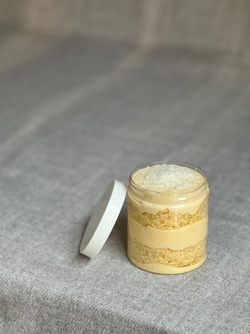Get ready to fall in love with our Coconut cake in a jar! It’s packed with creamy coconut goodness and fluffy cake layers that make every bite so goood you’ll want more. A fun and tasty treat that’s perfect for any time you need a little sweet! Allergens: Wheat, Milk, Eggs